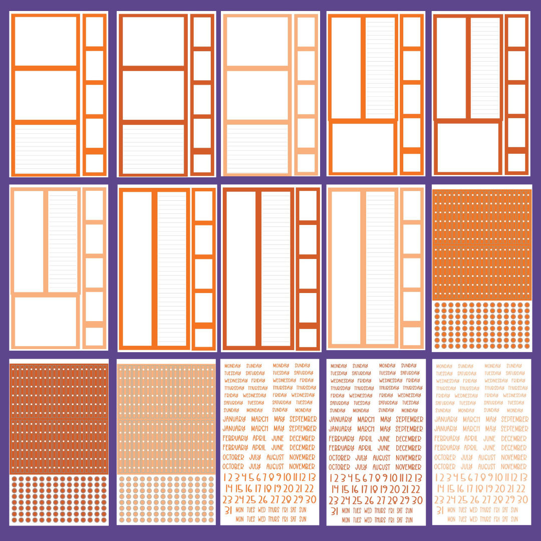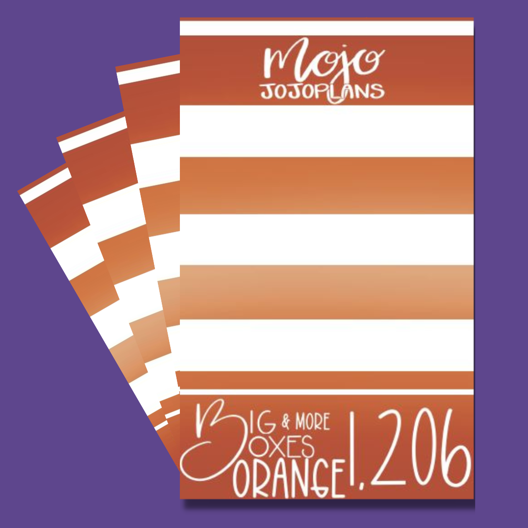 BIG Orange Boxes & More has everything you need to make your spread functional with 3 shades of red! Including all the boxes you could ever need, matching checklists and bullet points, pages of days, months and number stickers to complete the set! All stickers are sized to fit in a BIG Happy Planner.